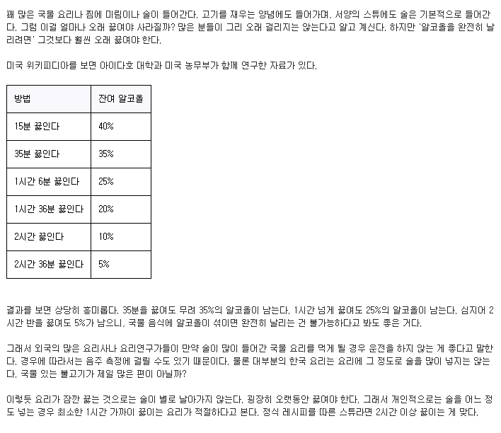음주측정에 걸려놓고 돼지국밥의 잡내제거용 술 때문이라는 주장은 뭐 ㅋㅋㅋㅋ 물론 국밥처럼 아주 오래 끓이면 당연히 모든 알콜이 날아가지만 일반적인 생각처럼 끓인다고 모든 알콜이 쉽게 다 날아가는 것은 아님