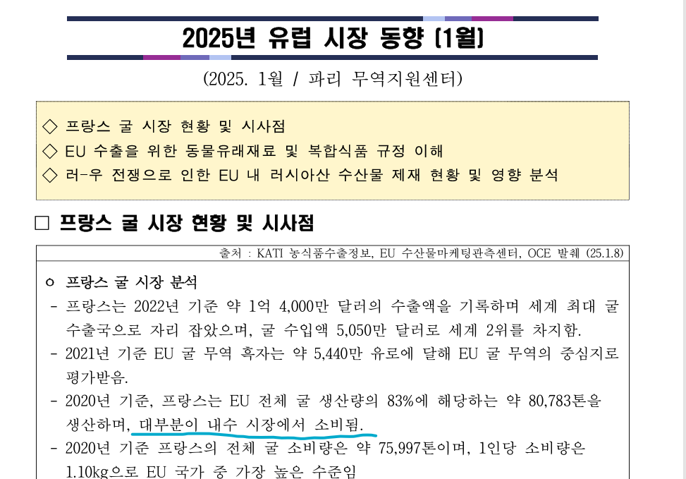 프랑스는 대부분 내수시장에서 소비되지만 최계최대의 굴 수출국이다? 8만톤 생산인데.. 우리나라는 굴 30만톤 생산하는데...저 내수시장은 eu를 뜻하는거야 프랑스를 뜻하는거야? | 25.02.12 16:21 | | |
