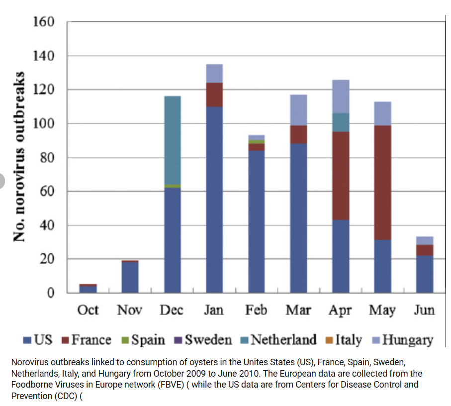 Oyster norovirus outbreaks are not limited to the US and they take place all over the world. Fig. 1 shows the number of norovirus outbreaks occurred in the US from October 2009 to June 2010 and reported to the US Centers for Disease Control and Prevention (CDC) and the Foodborne Viruses in European countries. It can be seen from Fig. 1 that norovirus outbreaks show strong seasonality with the outbreak peak occurring in December–March in the U.S. and April–May in the Europe. A similar finding was also reported by Verhoef et al. (2008). The number of norovirus outbreaks in European countries is accessible in a public sequence dataset in FBVE (http://www.noronet.nl/fbve/databases/). In addition to the seasonal variation, norovirus outbreaks may also depend on the latitude. While there is a large body of literature on norovirus outbreaks, systematic reviews of current status in detection of norovirus are rarely conducted (Karim and LeChevallier, 2004; Patel et al., 2008). In fact, there is no literature review of current status in detection of norovirus in oysters and forecasting of norovirus outbreaks in oyster harvesting waters. The primary objective of this paper is to identify the effective methods which can be applied to detect and forecast oyster norovirus outbreaks through a thorough literature review with emphasis on modeling methods. | 25.02.12 16:48 | | |