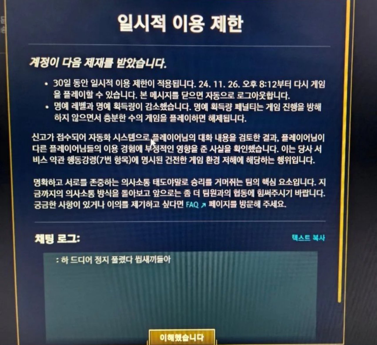 나 하는겜에도 가끔 채금먹었다가 풀려놓고 전체채팅으로 드디어 풀렸다 하고 욕섞는애들 보이는데 바로 신고눌러줌 ㅋㅋ