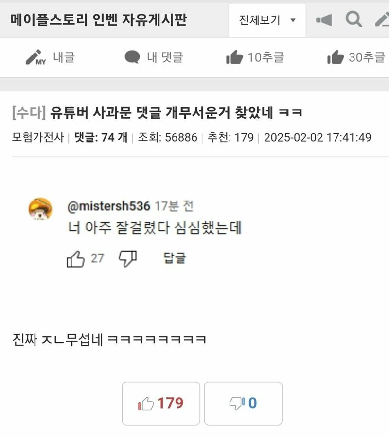 본문의 유투버가 메이플 많이했다- 라고 한 영상이 하나 있는데 실제론 레벨 10 찍음 사실상 주작이지 근데 메이플 유저들이 어 이것만 주작하지 않았을거같은데 하면서 이전 영상들 다 뒤적거리면서 편집 주작점들 다 찾아냄 | 25.02.13 16:50 | | |