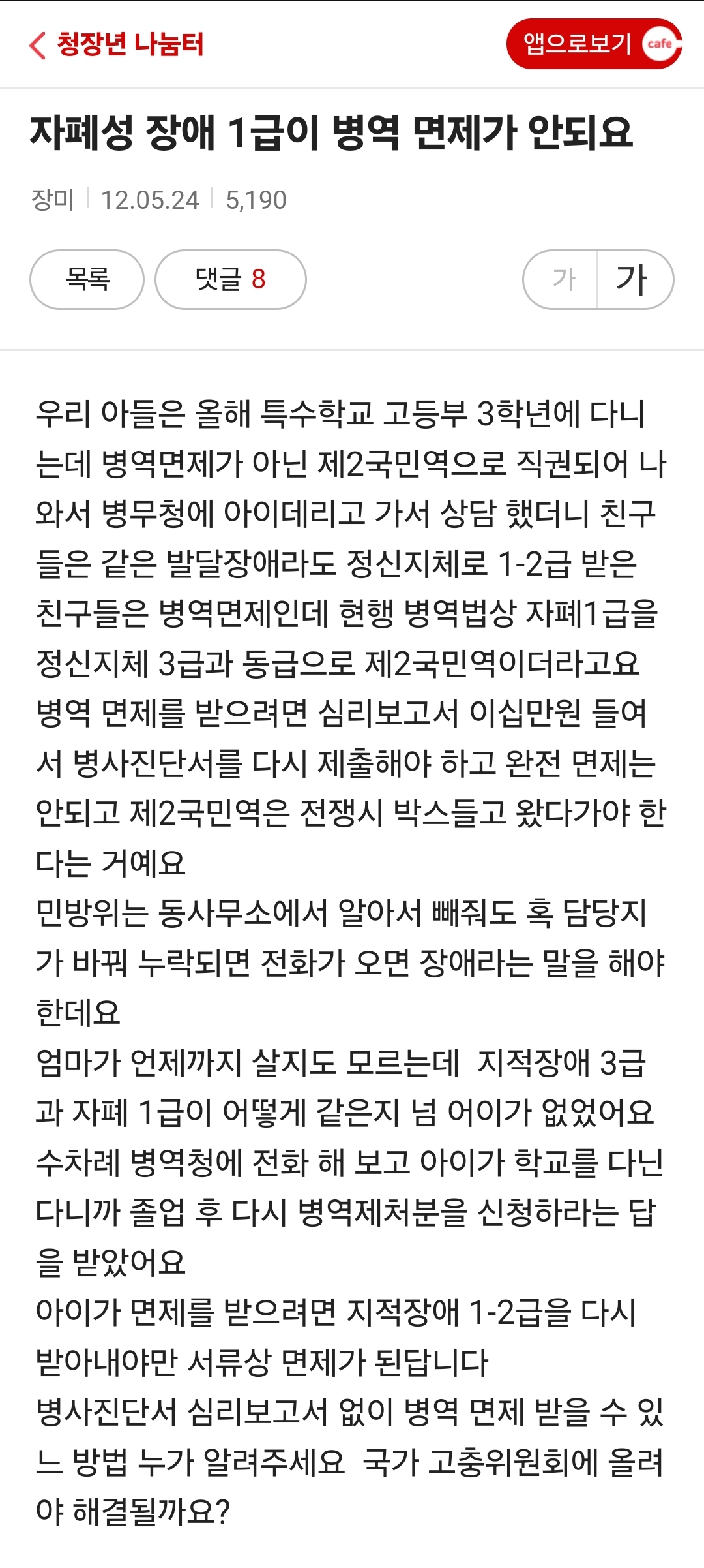 다들 알다시피 상류층들, 특히 그중에 국민들에게 문제의식 크게 느끼게 할만큼 홍보 영향력도 큰 연예인들이 줄줄이 허위 정신과 진단서로 병역면탈한 사건이 잊을만하면 벌어지는 데 (연기만 잘 하던가 자칭 증세 설명만 잘 하면 되는 분야라 유독 많음), 그 때마다 면제가 어려워진다 생각하면 지금 수준이 유독 이상한 상황인 건 아닐 거임. 이게 아무리 생각해도 완화될 수가 없어. 완화되면 바로 다시 면제 브로커 뜸. | 25.02.13 18:36 | | |