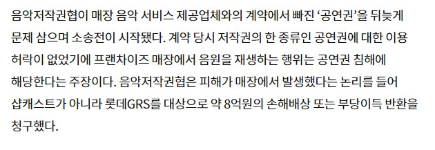 원래 매장용 음원은 공급받을때 공연권료까지 포함해서 계약을 하던가 알아서 내던가 해야하는데 공연권료 포함 안해놓고서 알아서 내지도 않았다고 소송걸린거임 | 25.02.13 20:08 | | |