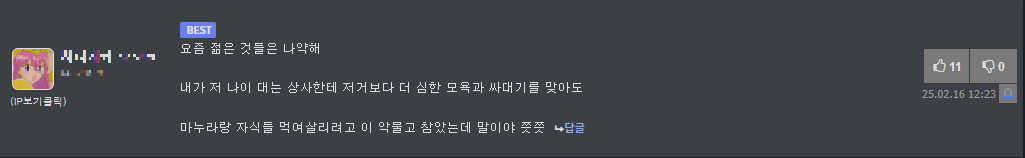 그걸 왜 참아 ㅂㅅ아 같이 죽빵 날리며 싸웟어야지 이렇게 말햇다가 노인네 한명과 싸움 붙은 적도 있었음 ㅋ | 25.02.16 17:50 | | |