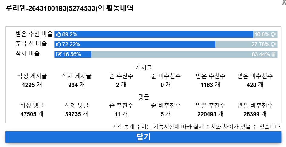 활동내역만으로 어그로 몰려서 존나 억울하셨나봄 글삭뿐만 아니라 준 추천/비추천수 + 받은 추천/비추천수 종합해서보니까 걱정마쇼