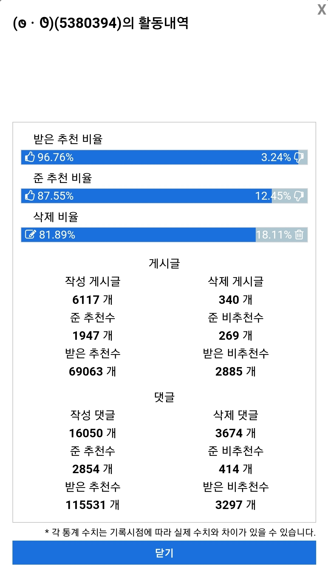 전에 " " 가 오피셜로 정상적으로 활동한 사람이면 받은 추비추 비율이 90퍼가 넘을수밖에 없다 라고 한적이 있어서 이정도로만 판단하면됨 준 추비추 비율은 사람마다 다르긴한데 준 비추비율이 높은사람은 좀 경계하는게 좋고 아예 없으면 미인증 깡계고 본인삭제비율은 보통 그 사건때 클리너 돌린애들때문에 기준의미가 없어져서 무시해도됨