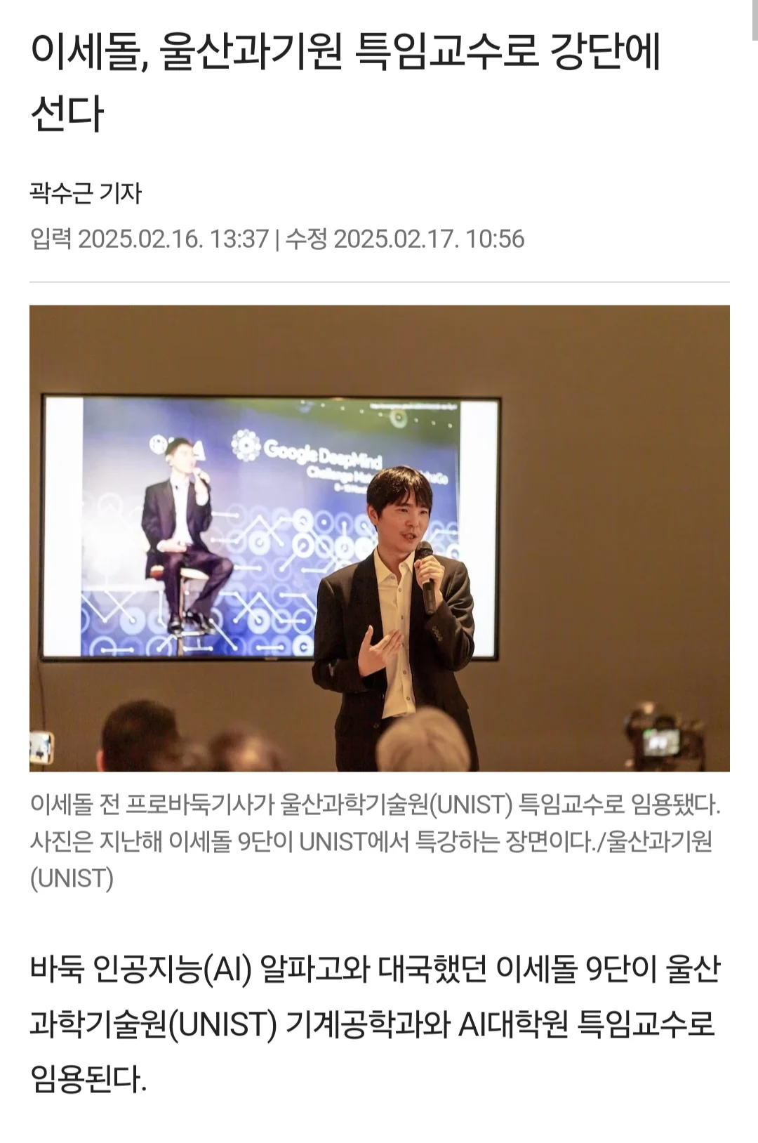 캡쳐만 보지 말고 기사도 좀 읽어보라구 2019년 은퇴한 이세돌 9단은 올해 1학기부터 이강수 울산과기원 기계공학과 교수와 공동으로 ‘이세돌 교수와 함께하는 과학자를 위한 보드게임 제작’ 강의를 맡는다. 이 수업은 바둑 기반 보드게임을 출시한 이세돌 9단이 울산과기원 1학년 학생들의 보드게임 개발을 지도하는 과정이다. 이세돌 특임교수는 “보드게임을 통해 과학적 사고와 창의력을 결합하는 경험을 학생들과 나누고 싶다”고 했다.