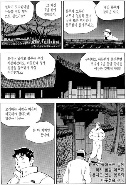 근데 그건 만화에 나온대로 성찬을 이용해 먹은 게 되는 거라 오숙수 성격에 성찬이 정말로 확연히 잘했으면 성찬에게 줬을 것 같애. 대등했으면(즉 누가 이겨도 할말없으면) 봉주 줬겠지 | 25.02.17 19:36 | | |