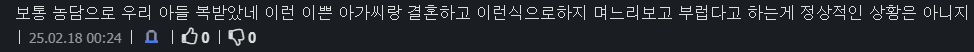 근데 며느리쪽 주변친구들도 동조 안해주는거보면 저기다 말 안한 뭔가 더 있을거같은데 | 25.02.18 12:01 | | |