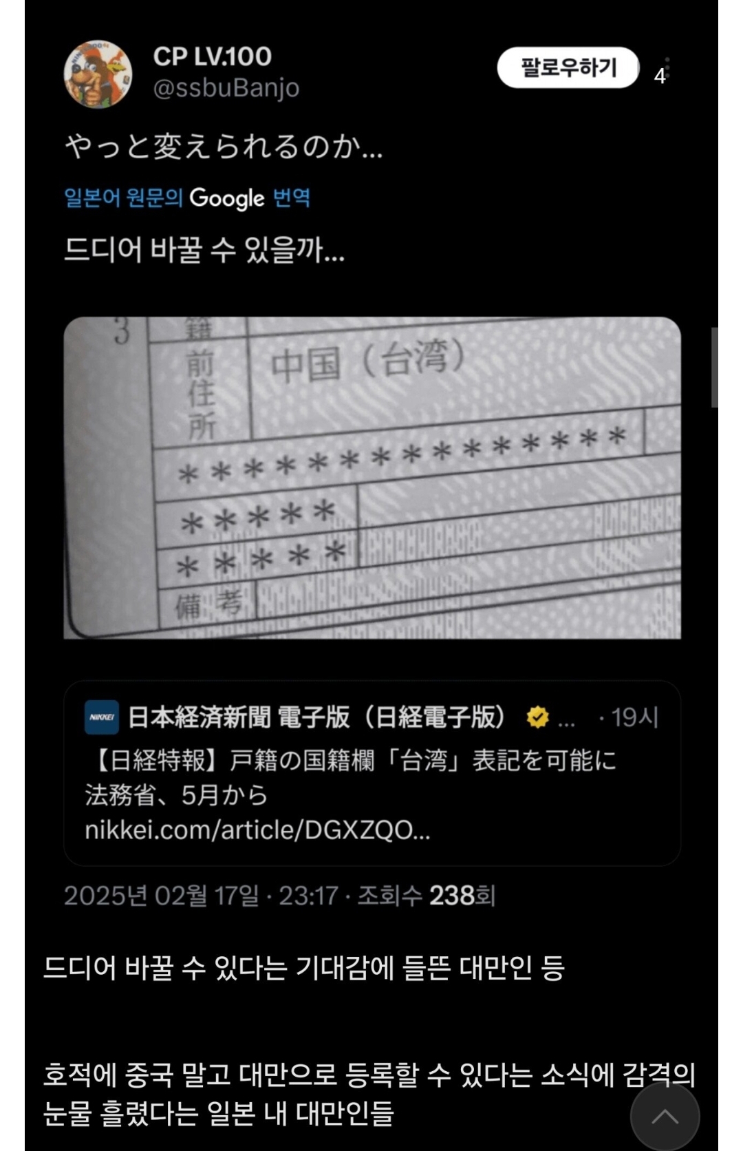 ㄴㄴ 저건 주소고 국적 부분은 그냥 '중국' 단독 표기. 사실 신분증에는 대만 표기 가능했음. 호적에도 표기 가능하게끔 한 행정적 일원화를 너무 띄워주는 느낌. | 25.02.18 09:45 | | |