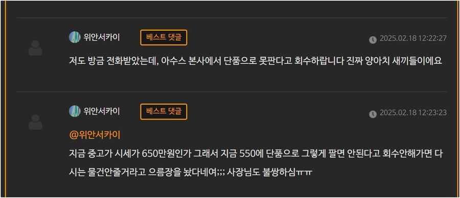 현재 중고 시세보다 싸게 팔려서 글카 단품으로 안판다고 어딘가 끼워서 인질 팔이 할꺼라고 다 회수 | 25.02.18 12:45 | | |