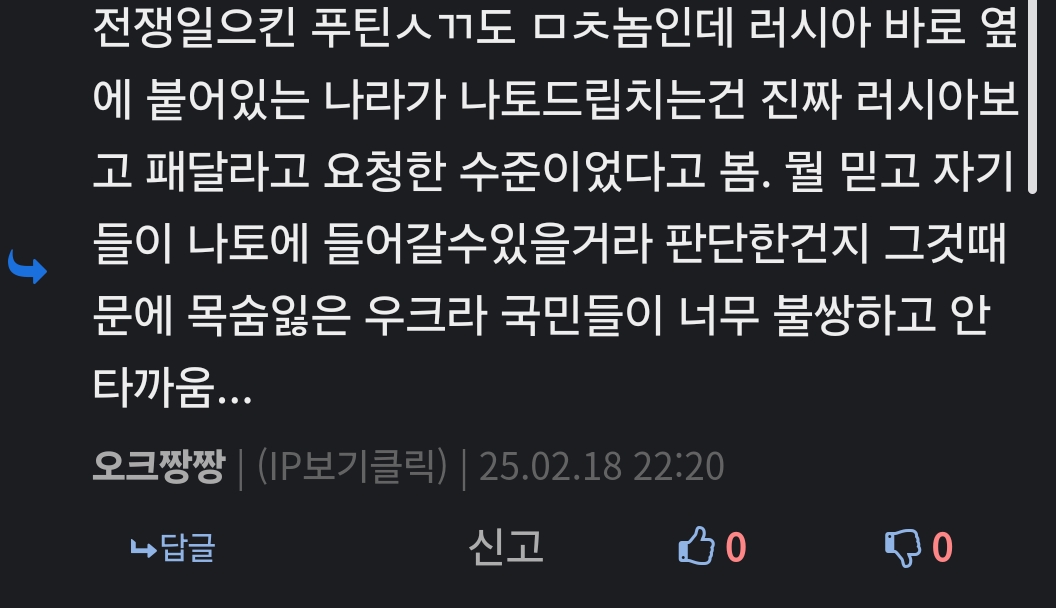 그 이런 말씀 드리기 좀 그런데 우크라의 나토가입 시도나 안전보장 요구가 나온 이유가 애초에 14년 러시아의 크림 강탈+돈바스 전쟁인데 말씀하시는게 좀.. | 25.02.18 22:30 | | |