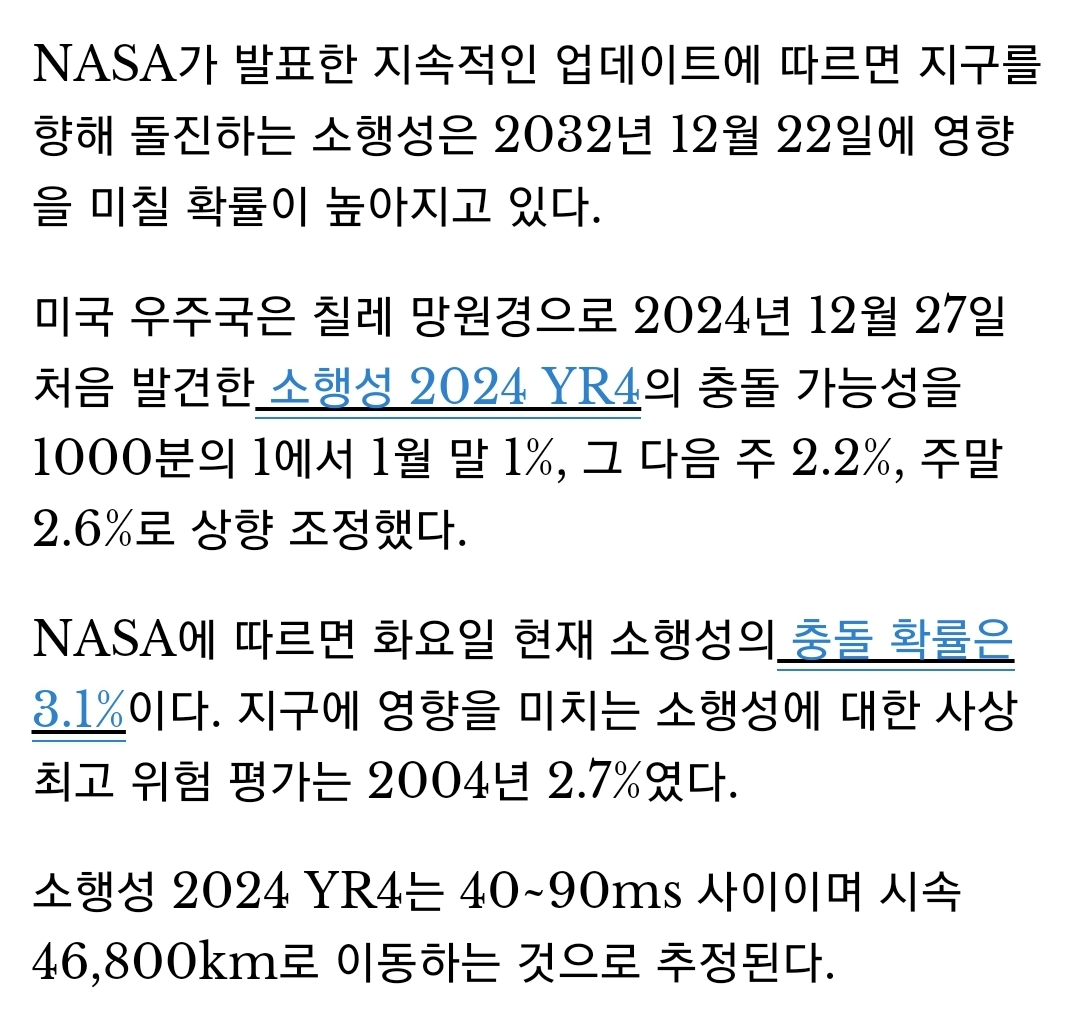 그나마 다행인건 돈룩업 될만큼 크진 않음.. 구성물질이 덜 단단해서, 공중에서 터져주면 심각한 피해까지는 안올거라고 평가중. | 25.02.19 05:23 | | |