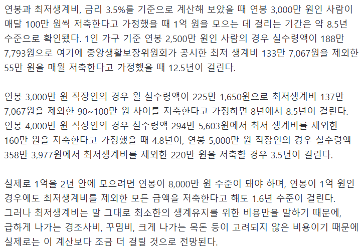 연봉 1억이 최저생계비 제외 모두 저축해도 20억 모으는 데 32년 걸림. | 25.02.19 12:04 | | |