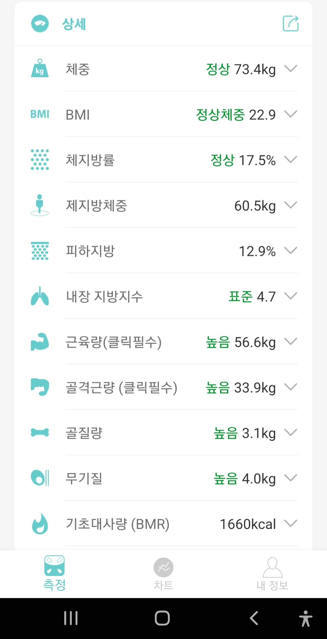 BMI로 해서 저 정도지, 정상체중에 체지방율 개 높은 사람 엄청 많음. 남자도 체지방율 30%넘는 사람 비율 적지 않음 체지방의 밀도 0.8이고 근육이 1.2임, 근육이 무거운 건 맞지만 인터넷에 떠도는 동일 무게 대비 근육, 체지방 비교 사진들 구라임 근육만으로 과체중이 되려면 최소 3년 이상 꾸준히 고중량으로 운동을 해야하는데 그런 사람들은 그리 흔치 않음 | 25.02.20 00:07 | | |