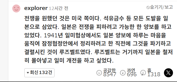 보리스 ㅁㅊㄴ이 진주만 이야기 꺼내가지고 일본애들 화난거넼ㅋㅋ 시발 그거랑 이거랑 같냨ㅋㅋㅋㅋㅋㅋㅋ 아니 뭐 한국입장에서야 그놈이 그놈이긴 한데 | 25.02.20 23:36 | | |