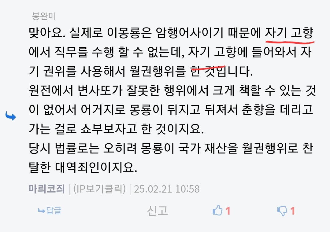 아니 그 판본을 가져오라고요 ㅋㅋㅋ 너님이 이몽룡이 고향에서 암행어사질 하는게 대역죄라면서요 그말은 이몽룡이 사건의 무대가 고향이라는 판본이 있다는 말 아님?? 상식적으로 작가도 독자도 그 시대 사람인데 기본적인 오류가 나겠냐고 | 25.02.21 13:04 | | |
