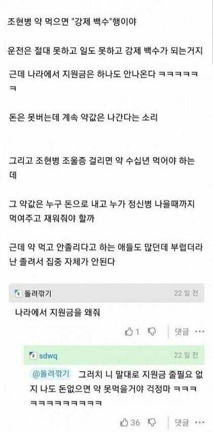 약 먹게 지원 해주기는 커녕 돈도 못 벌게 해줄거면 약 안 먹으면 됨 ㅋㅋㅋㅋ 주변이 ↗되지 환자 본인이 ↗되나 ㅋㅋㅋㅋ | 25.02.21 14:30 | | |