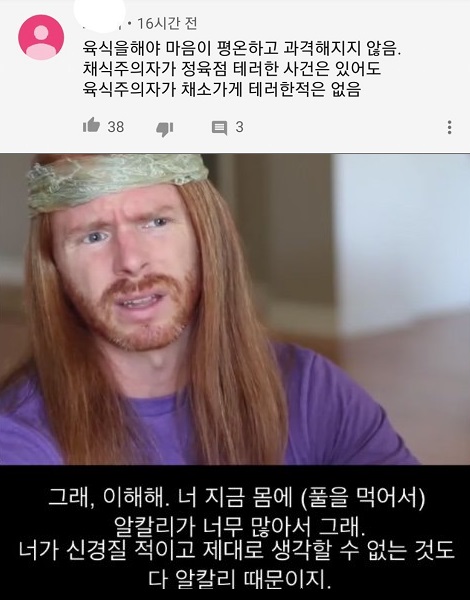흠... 일단 이 글에도 많이 있는 것처럼 유게에서 채식주의에 대해 적대적인 발언하는 유게이들은 자주 봤는데 그 역은 본 적이 없군.... | 25.02.21 17:57 | | |