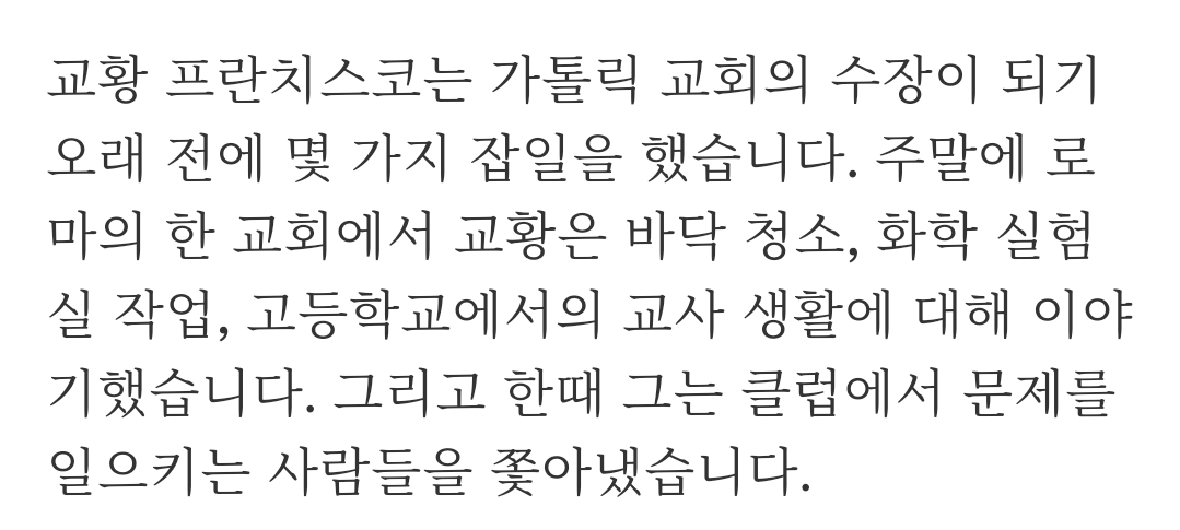 현 교황이 남미출신에 늦은 나이에 사제가 된 특이한 경우이긴 함. 매우 늦게 사제가 된 편인데도 빨리 주교 자리에 오른 걸 보면 능력치가 만랩이셧던 듯, 한창 중남미 독재 시절에 예수회 탄압 받던 시절에 수장을 했으니 정치적 수완이 보통은 아니신 분이지. 전임 교황이 교회쪽 엘리트들과 여러 이유로 충돌하고 스스로 물러나며 교황에 오른 경우라 여러모로 이례적인 선출이긴 했음. | 25.02.22 18:50 | | |