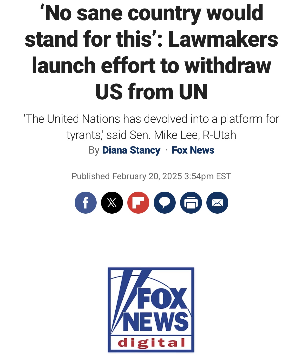 뭐긴 뭐야 올게 온거지.. 국제 단체 탈퇴 이것저것 하길래, 제일 상징적은 UN은 그래도 탈퇴안하는 군 했는데, 그걸 할려고 하네... 뭐 발의일 뿐이라 통과는 못할 거라고 생각하지만. | 25.02.23 02:30 | | |
