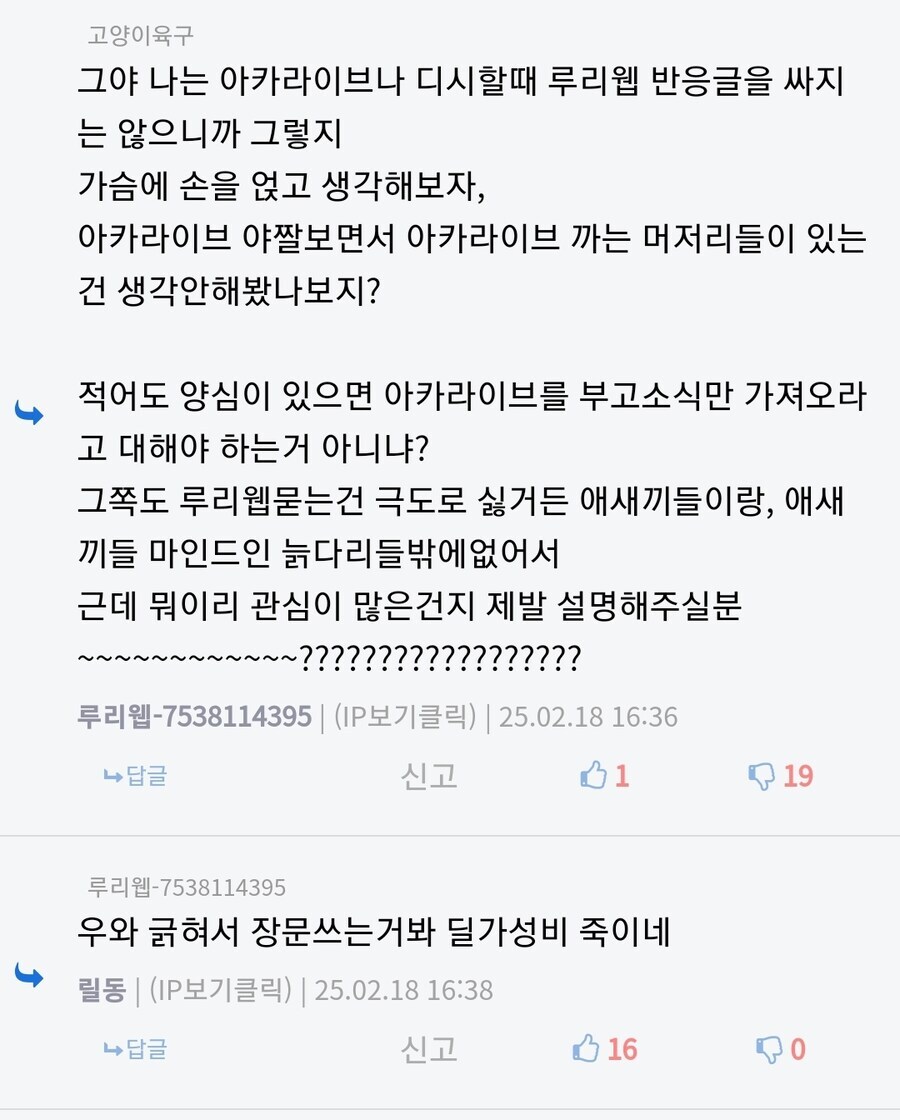 출처없이 루리웹 글 도용당한건 훈훈히 마무리된거 보여준 글에 아카 들어가서 염탐하니 근첩이 욕먹네 아카한번이라도 했으면 욕할 자격없네라며 댓글단 빌런도 있었음...오늘 무슨 날인가봐.. | 25.02.23 02:54 | | |