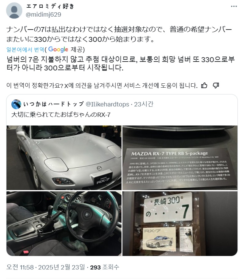 일본은 번호판 번호 4자리는 돈내면 고를 수 있다고 하더라. 나머지는 랜덤. | 25.02.23 16:21 | | |
