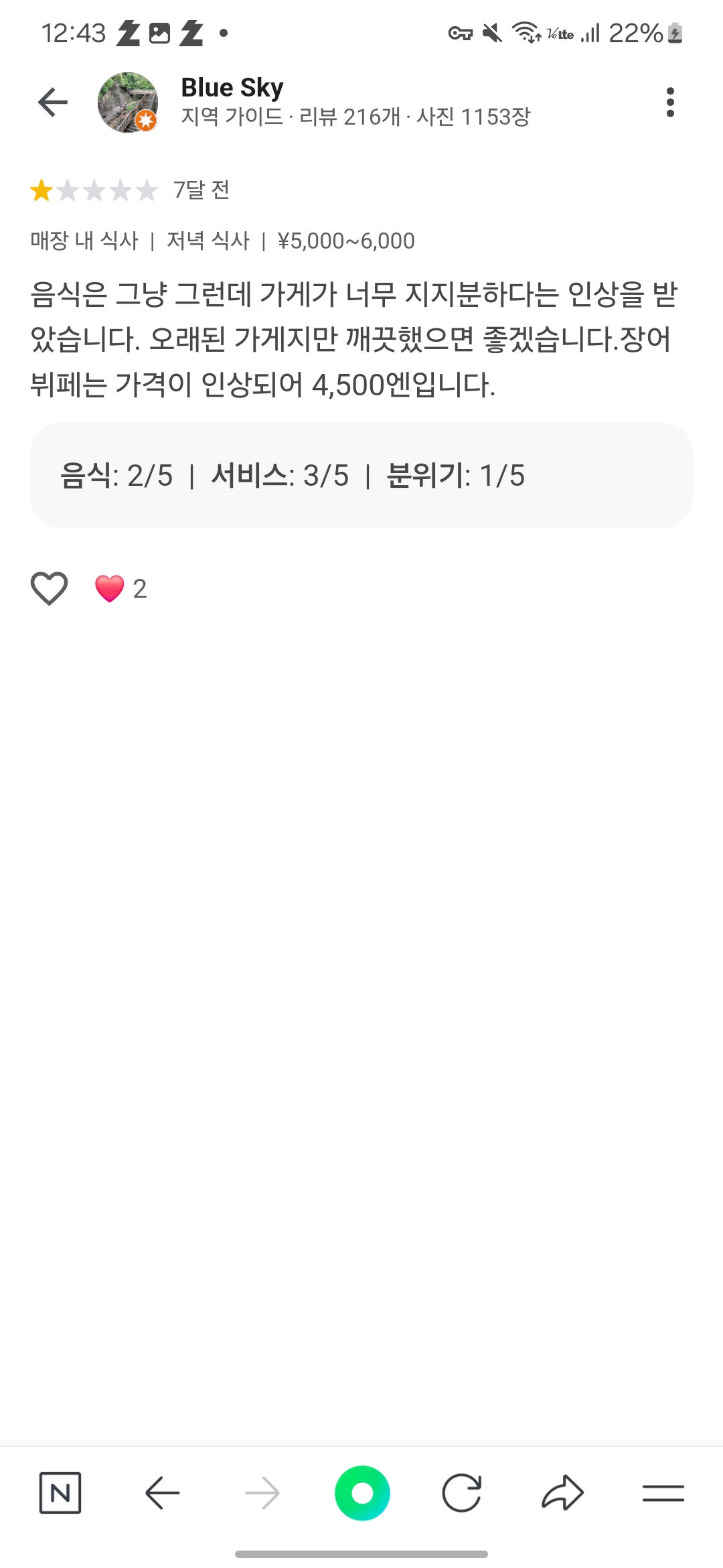 리뷰보니 서비스가불친절하다는평 그리고 이젠 4500엔이라네 장어니까 4500엔이여도 괜찮나?