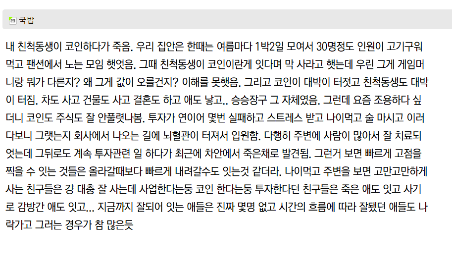 우리회사에도 한 사람 회사에서 돈 횡령해서 코인해서 따갚되 시전하다 안돼서 자1살로 가셨네 그러고보니 | 25.02.24 11:26 | | |