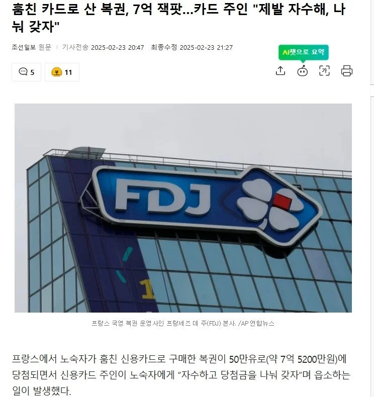 그랄수도 있지만 카드주인이 인터뷰해서 도난관련으로 어떠한 신고도 하지않을것이며 당첨금 절반을 주겠다고 공증까지 받으면 나타날지도 ㅋㅋ | 25.02.24 17:50 | | |