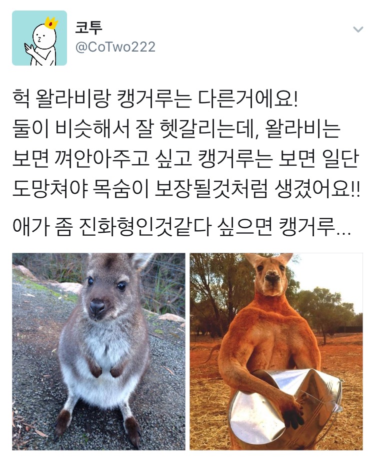 똑바로 섰을때 왈라비는 성인남자 허리께 키고 그보다 크면 거의 캥거루임. 본문의 쟤는 왤케 왜소해 보이냐면 캥거루도 종별로 덩치가 차이가 나서 그런거임.