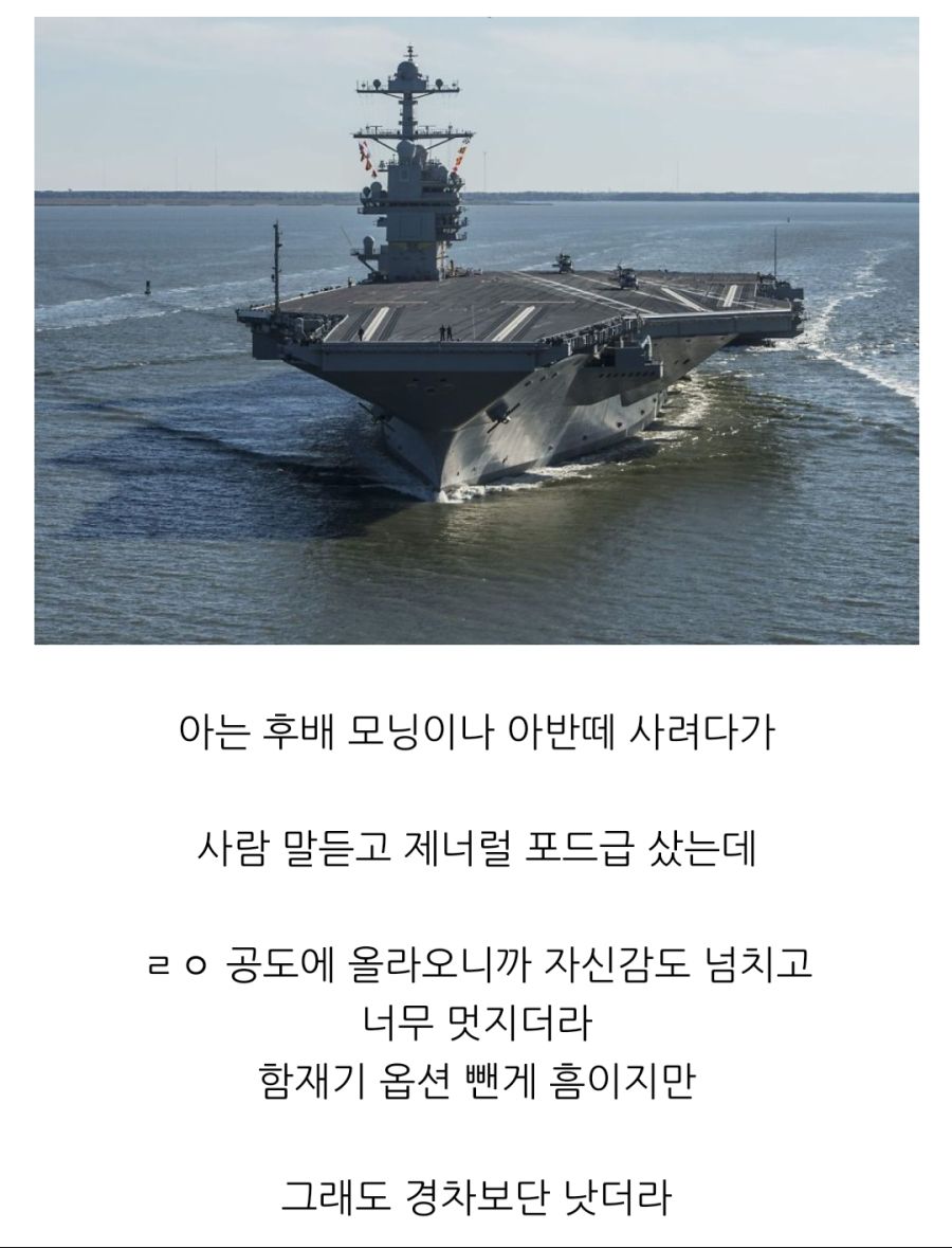 에이- 함재기 옵션이 필수인데 그걸 빼네 ㅋㅋㅋㅋ 돈 좀 보태서 말벌은 무리더라도 톰캣 정도는 가져야 기본인데 ㅋㅋㅋㅋㅋ | 25.02.26 00:40 | | |