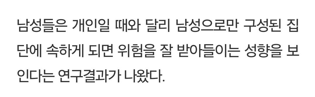 그래도 남성 개인보다 남성만 있는 집단에서 더 위험 감수가 나오는 것 보면 이걸로 축약하는 건 어려움이 있다고 보임. 다만 남성-여성 혼성 집단에서도 남성이 위험 감수 성향을 보인다면 이 의견도 일리가 있다고 볼 수 있겠지만 해당 내용을 위 기사에서 확인하기 힘들어서 아쉬움. | 25.02.26 11:34 | | |