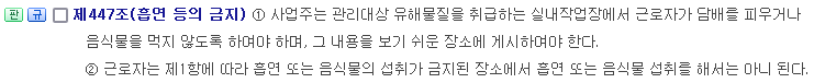 산업안전보건기준에관한규칙 제447조(관리대상 유해물질 취급장소), 제458조(허가대상 유해물질 취급장소), 제493조(석면 취급장소), 제506조(금지유해물질 취급장소), 제590조(방사성물질 취급장소), 제603조(곤충 및 동물매개 감염병 고위험 작업장소)에서 특정 (실내)작업장에 대해 흡연 및 음식물 섭취를 금하고 있으니 해당 사업장에서 근무하는 유게이들도 참고하라구
