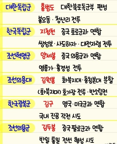 아니 저런걸 안배우는게 아니라 그냥 역사적 사건 이야기를 배우지 김좌진 장군의 부대이름은 무엇무엇이었다,홍범도 장군의 부대이름은 무엇무엇이었다 같은건 안배운다는 이야기야.. | 25.02.27 11:24 | | |