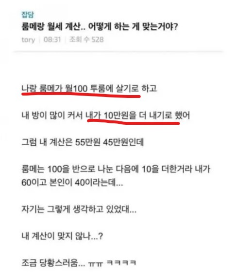 내가 너보다 10만원을 더 낼게가 아니라 100만원을 반반 한 금액인 50에서 10만원 더 내는거 아니었음?? 그래서 나는 60 너는 40 내는게 맞다는 거고 | 25.02.28 00:38 | | |