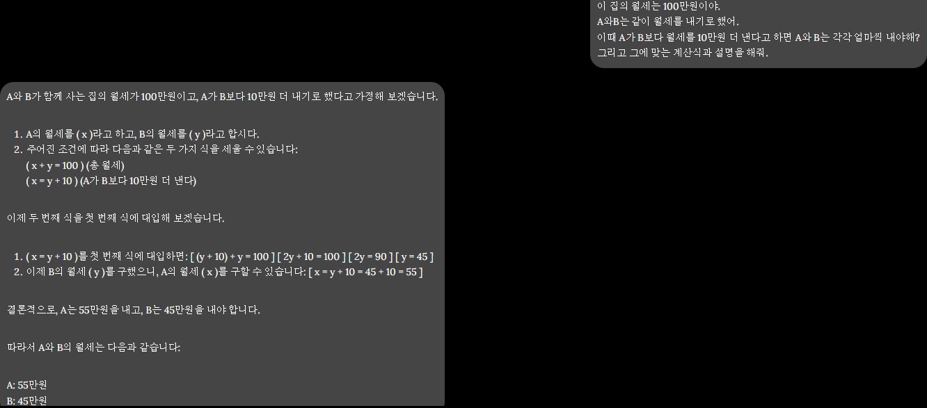 초등학교 1학년 사칙연산을 안배우셨나보네요. 고작해봐야 두자리 수학인데 55-45=10 , 60-40=20 이걸 써줘도 이해 못할거같으니 해설까지 써드릴게요 해당 계산 자체는 총량이 정해진 값에서 나누는 문제에요 100이라는 총량이 정해져 있고 나눠야할 대상이 2명으로 정해져있죠. 사람들이 가장 많이하는 오류가 단순히 반반 나누면 5대5고 50, 50을 기준을 잡고 시작하는데 전제 자체가 A가 B보다 10만원을 더 낸다기 때문에 문제의 기준점 자체가 5대5로 시작하는게 아니라 B를 기준으로 시작하는겁니다. 그럼 계산식이 어떻게 될까요? (총량값 - 더낼값) ÷ 인원수 = B의 값 100만원 - 10만원 ÷ 2 = 45 위 계산 이후 B의 값 + 추가값 = A의 값 45 + 10 = 55 식을 한국말로 다시 풀어드릴게요 A는 B보다 10만원을 더 냈다. A는 55만원을 B는 45만원을 냈다. 이해 하셨죠? 이해가 안됀다면 60과 40까지 추가 설명해드릴게요 단순 계산만 해도 그 차이가 20이 나는 순간부터 값 자체가 거짓이죠. 아까말한 중간값 에서 식을 시작해버렸기 때문입니다. 이 경우 A가 (중간값에서) 10만원을 더 냈다 가 참이 될수있지만 생략된 중간값 이라는 조건과 B가 중간값에서 10만원을 덜 냈다 라는 추가 전제가 빠졌기 때문에 "10만원 더" 라는 계산 식 자체가 틀린게 됩니다. 룸메가 낸 값의 "-10만원"의 존재 자체를 무시하니 20만원의 차이가 나버린거죠. 몇가지 다른 예시를 통해 이해를 돕겠습니다. 1번 문제, 총량이 정해지지않은 값의 문제입니다. A와 B 는 사과를 먹었다 A는 B보다 사과를 "1개 더" 먹었다. B는 사과를 4개 먹었다. A는 몇 개의 사과를 먹었는가? 2번 문제, 총량과 B의 값이 정해진 문제입니다. 사과가 총 9개가 있다. A는 B 보다 사과를 "1개 더" 먹었다. B는 사과 4개를 먹었다. A는 몇 개의 사과를 먹었는가? 3번 문제, 총량만 정해진 문제입니다. 사과가 9개가 있다. A는 B보다 사과를 1개 더먹었다. A와 B는 각각 몇개의 사과를 먹었는가? 유치원생들도 푸는 문제입니다. 쉽게 계산하시라고 일부러 10이 아닌 9로 제시해드렸습니다. | 25.02.27 21:35 | | |