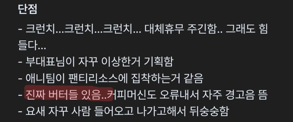 매일 밤늦게 새벽까지 주말에도 나와서 일하고 자기들끼리 스터디하고 크런치는 몇달씩 직접 해보면 쉽지않음 잘하고 잘맞으면 좋겠지만 몸과 정신이 서서히 망가짐 | 25.02.28 13:44 | | |