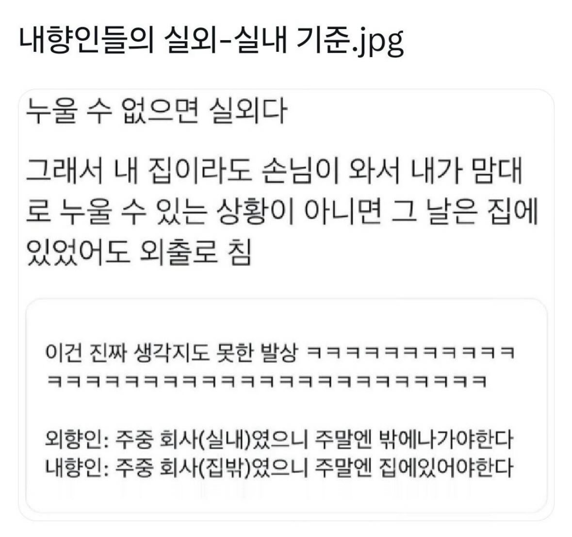 심지어 내 집이어도 손님이 있는 순간 몸에서 '밖'으로 인식함 I에게 '남들 신경 써야함' 상황은 전부 바깥이야