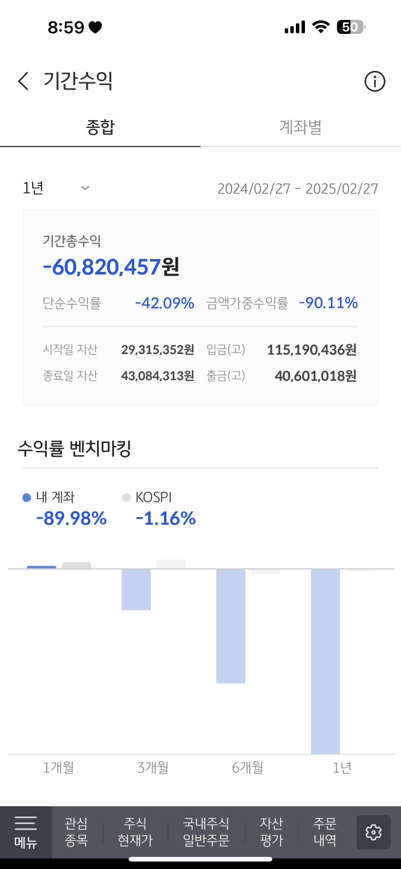 대세 상승장에서도 손실 보는 사람이 반 조금 넘음. 등락 몇 번 하면 95~98%가 이제 예적금보다 돈을 못 벌게 되는 거지. | 25.02.28 20:39 | | |