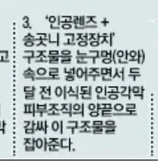렌즈(수정체)가 자라는 게 아니라 입 안에 활발하게 분열하는 조직을 이용해서 각막과 유사한 조직(인공 각막)을 만들고 송곳니를 가공해서 만든 틀로 눈꺼풀에 이식한 입안 조직으로 만든 인공각막과 이식할 인공렌즈를 고정하는 틀로 쓰는 거 같음. 거부반응 없는 자기배양 이식술인거지