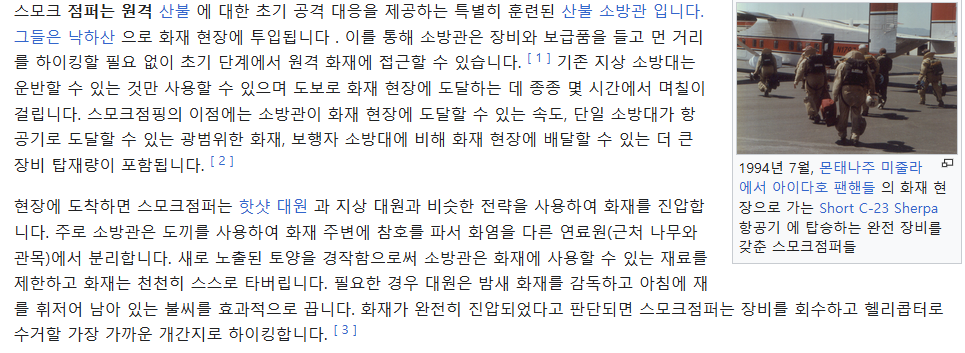 저 나라는 모르겠지만 우리나라 동일직업이 공중특수진화대라고 있는데 헬기타고 내려와서 의외로 갈퀴로 낙엽과 깔비(소나무낙엽) 긁어서 연료제거하여 불머리를 죽이는 역할을 합니다. 공수부대 출신들을 많이 고용합니당. 우리나라에는 지자체 운영 전문예방진화대, 국유림관리사무소운영(산림청) 특수진화대, 산림청 운영 공중특수진화대가 있습니다. | 25.03.01 18:20 | | |