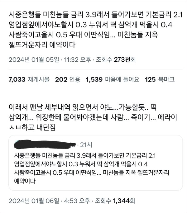 은행 정기 예적금 금리라는게 보통 년이율을 얘기함 예를 들어서 시내 돌아다니다 보면 은행 앞에 정기예금 5% 플랭카드 걸려 있으면 그 은행에 100만원 1년간 입금하고 묶어두면 은행 이자로 5만원 준단 얘기 근데 6개월 기간한정이면 은행에 6개월 묶이는 대신 이자도 그 절반인 2만 5천원 준단 얘기... 게다가 저 5%도 여러 조건들을 충족시켰을 때 주는 이자라 실제로 가서 상담해보면 기본 금리는 보통 3 ~ 2.7% 이런 경우가 많음 그리고 이 모든 이자는 세전이라 다시 그 이자 5만원에서 이자 소득세로 얼마 또 떼어가서 세후 실질적으로 받는 돈은 모든 조건을 충족 후 은행이 약속한 이자 5%를 다 받는다 처도 5만원 보다 더 작음 | 25.03.01 17:31 | | |