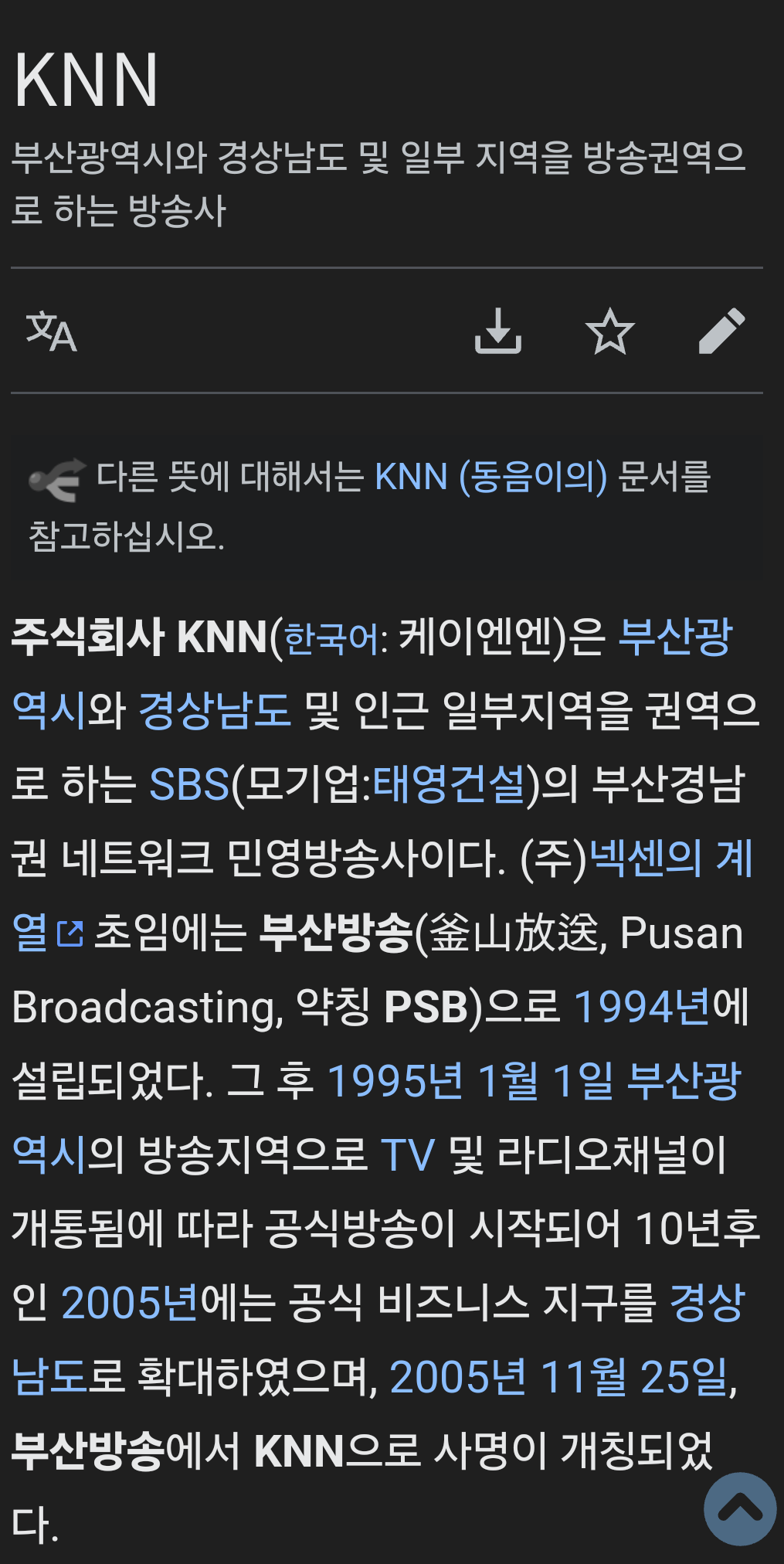 <리빙포인트> https://www.knn.co.kr/ KNN는 부산, 경남을 가시청권으로 하는 "지상파" 민영 방송사으로 SBS 네트웍스에 소속됨. (물론 OBS, 경인방송 뺸 지역민방이 SBS네트웍스 이긴하지만) 그렇기 떄문에 꺼무위키에서도 제도권언론사로 취급됨. 참고로 KNN 최대주주는 넥센타이어. | 25.03.01 15:37 | | |