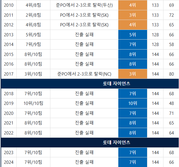 정보 : 최근 15년간 롯데가 70승 이상을 기록한 건 3번이다.