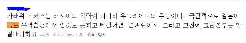 솔직히 원종이 운운할 때 제일 아쉬운 게 그거임. 근본은 극단주의에 잠식되어 맹목적으로 강자를 추종하는 사회부적응의 문제인데 너무 일뽕에만 집착한 나머지 일본만 안 빤다는 이유로 원종이와 동급인 놈들이 별 문제 없이 넘어감 | 25.03.01 16:17 | | |
