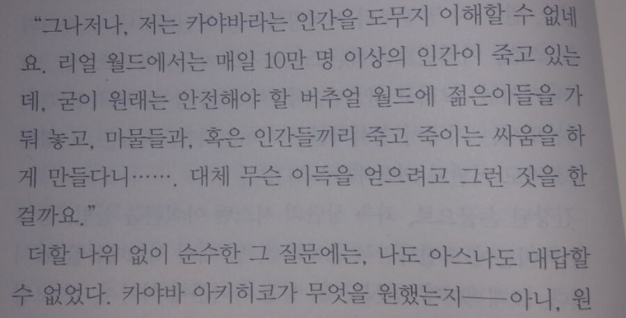 키리토 : 그냥 겜창폐인 인생이었는데 카야바 덕분에 SAO 클리어 영웅이라는 칭호에다 재벌집 미인 아내와 이쁜 여자 하렘 구성원들과 이쁜 전자 딸내미 겟 사치라는 기억도 가물한 원 나잇 상대만 빼면 손해본게 없고 이익만 잔뜩 얻어서 팔자 핌 아스나 : SAO 전에는 강남엄마 못지 않는 극성맘 엄마에게 시달리며 맨날 공부강요당하고 싫어하는 남자와 약혼 강요당하는 괴로운 일상 반복 SAO 사건 겪어보니 반항심과 간도 커져서 강남극성엄마에게 개기고 반항해서 드디어 자유를 얻음 원래는 강남극성엄마때문에 대인관계 아싸였는데 SAO 덕분에 원하던 친구 잔뜩 사귀고 비록 겜창폐인이지만 잘생긴 공돌이 남친에 이쁜 전자 딸내미 겟 둘 다 SAO 하기 이전보다 손해 본 게 없고 오히려 카야바 덕분에 팔자 제대로 핌 덕분에 스톡홀름 증후군에 제대로 걸려서 틈날때마다 카야바를 빨아주고 이득 얻은 이 둘이야 나름대로 당위성과 이유가 있겠지만 허나 이걸 보는 독자와 제3자는 결코 공감 이해 못하니 간극이 큼 | 25.03.01 20:17 | | |