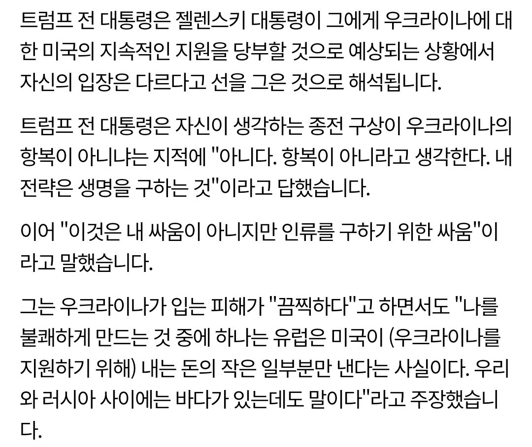 트럼프 : 넌 좀 감사할 줄 알아라 젤렌스키 : 감사하고 있고 저번에도 감사 표현 했음 트럼프 : ㄴㄴ 너 감사 안함 트럼프 : 전쟁 끝낼 생각 없음? 젤렌스키 : 끝내고 싶지. 근데 그 뒤에 안전이 보장돼야지 트럼프 : ㄴㄴ 넌 전쟁 끝내고 싶으면 내 말 들어야됨 넌 아무 것도 못함 그냥 말 안듣고 지가 무조건 옳다고 밀어붙임 | 25.03.01 20:01 | | |