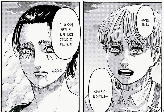 애니쪽 표현이 원래 작가가 말하고 싶어했던 의미인걸 보면 만화 대사는 대략 이렇게 풀어야 함 아르민 : 에렌 니가 이런 끔찍한 학살을 저지른 건 틀림없는 잘못이고 니가 우리를 지킨답시고 이런 천인공노할 짓을 했으니 뒤는 우리가 어떻게든 수습해볼게 여태껏 너 혼자 많은 짐을 지게 하고 힘들게 한 거 같아서 미안하고 살육자가 되면서까지 한 이 방법은 틀렸어도 우리를 지켜주려고 한 건 고맙다