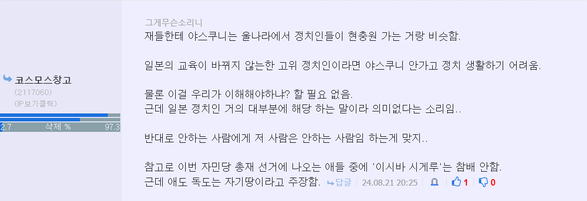 유게에서도 야스쿠니 참배 실드치면서 비슷한 소리 하던 애 있었는데 댓삭튀하더니 요즘 안 보이네